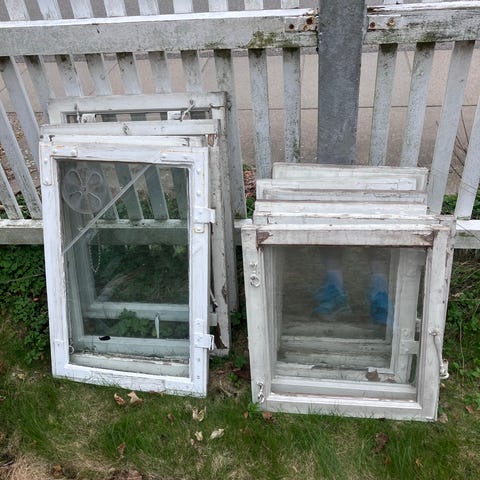 Gamle trævinduer med rammer i hvidmalet træ. Flere vinduer i forskellige størrelser, nogle med sprosser og enkelte med matteret glas. Malingen er slidt, og der kan forekomme afskalninger og vejrpåvirkning. Egnet til reparation, genbrug eller projekter, hvor originale trærammer ønskes bevaret eller ombygget.