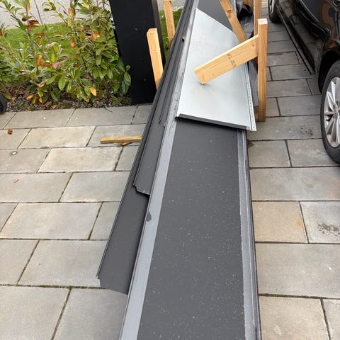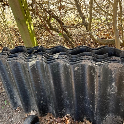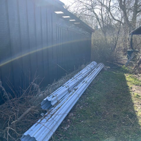 Afhentes gratis. Afskårne tagplader med borehuller. En rest vi ikke skal bruge. Borehuller er med 60 cm afstand, passende til lægter.