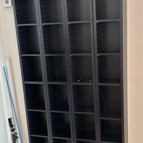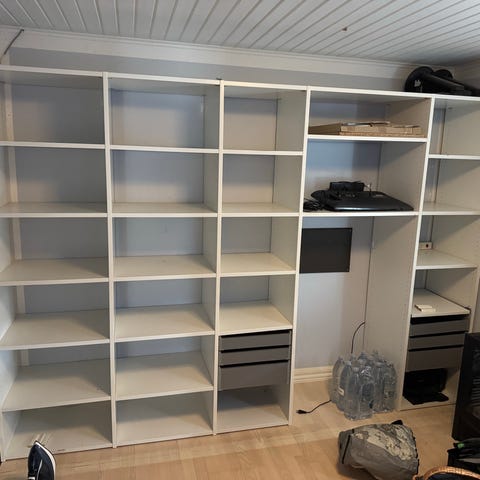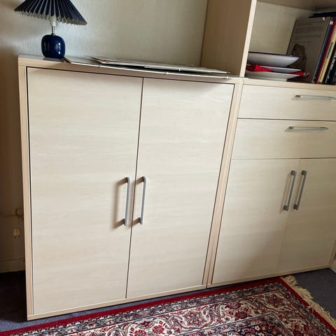 Valnød med hvide låger og stål greb. 3 skuffer og 5 skabe. 3 hylder. Nypris 10.000,-