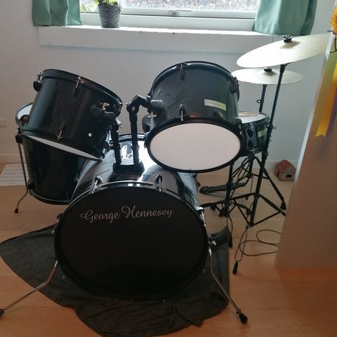 Trommesæt til børn. God stand, næsten ikke brugt. Alder 5-10 år med stol. Sort.