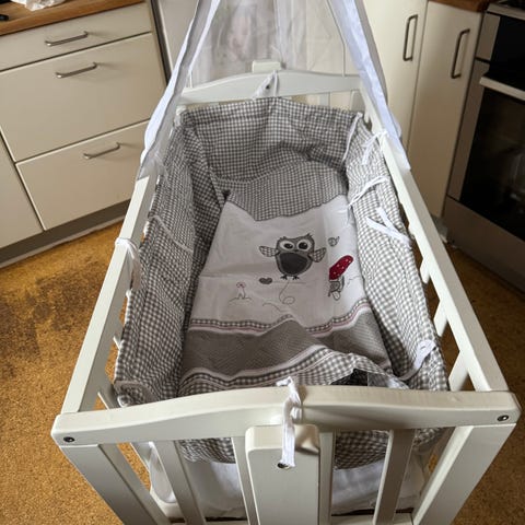 Vuggen har almindelige brugsspor, men fungerer som den skal. Kun brugt til ét barn i de første 6 måneder. Madras medfølger