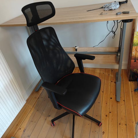 Super fed gul stol, som kan justeres i højden og ryglænet. Man sidder meget behageligt