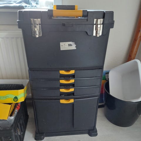 Stanley værktøjskasse på hjul i sort og gul plast. Består af flere stablede bokse med separate rum til opbevaring af håndværktøj og tilbehør. Øverste del har indsatsbakke med rumopdeling. Udstyret med teleskophåndtag, bærehåndtag og kraftige låseklips. Egnet til transport og opbevaring af værktøj på værksted, byggeplads eller i bil.