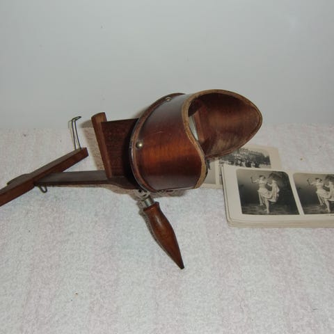 Billedbetragter - 1800-tallet, kirsebærtræ, eboniseret, lakeret, rektangulær krop dobbelthængslet, fin slyngedekoration, med forsænket rundt forstørrelsesglas, indvendig med folde- og glidende objektholder og stativ ,metallukning