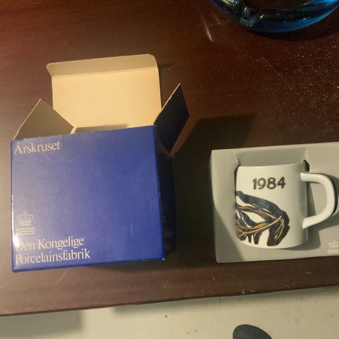 årskrus 1974 porcelænskrus hvid med blå dekoration