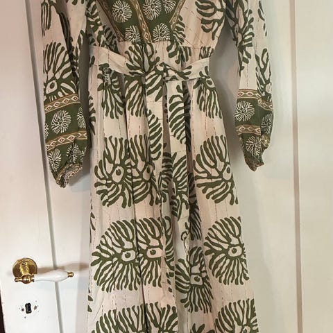 Let og behagelig sommerkjole med ærmer fra By Clara str M/L. Se alle detaljer på billederne. Har også inderfoer, så den ikke er gennemsigtig. Mærket er desværre klippet af, men det materialet føles som viskose/polyester.