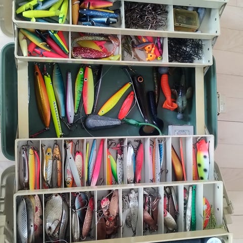 Grejboks fra Flambeau, med diverse blink, spinnere, woblere osv til sø, å og kystfiskeri, efter ørred, aborre, gedde, hornfisk m.m. Både nyt og brugt. Abu, Kinetic, Westin m.m. Se billeder.