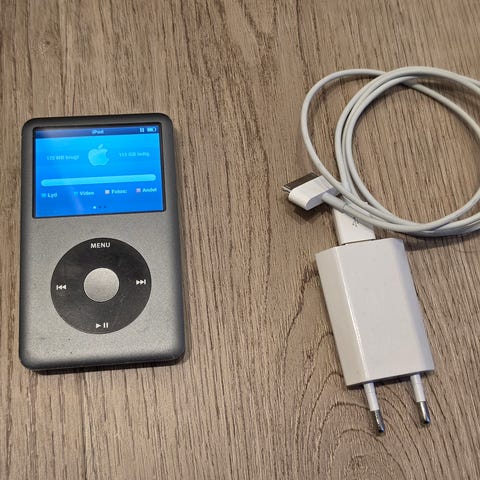 Apple iPod bærbar musikafspiller. En kompakt MP3-afspiller med click wheel-betjening og farveskærm på fronten. Enheden har metalbagside med indgraveret iPod-logo. Velegnet til afspilning af musik på farten via hovedtelefonudgang. Understøtter synkronisering af musikfiler via computer afhængigt af model og softwareversion.