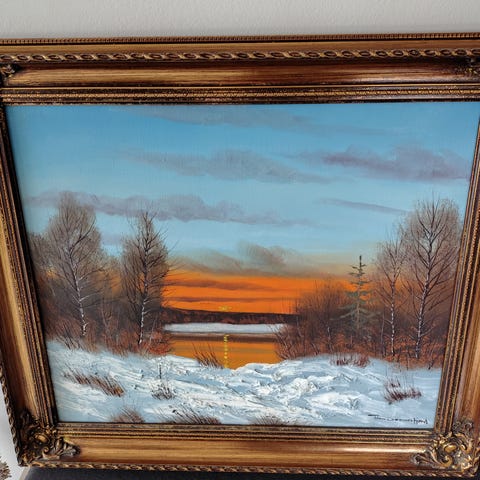 Et oliemaleri af en skov om vinteren.