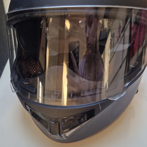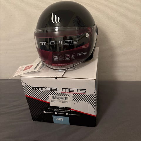 Takachi TK-10 Pilot motorcykelhjelm i sort med klart visir. Hjelmen er mærket med størrelse L (600) og vægt ca. 1280 g ± 50 g. Godkendt efter ECE R22-05 standard.