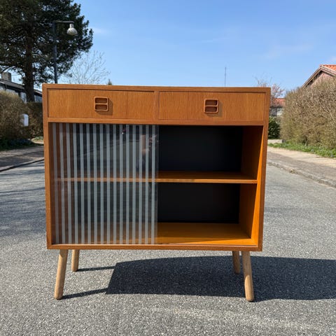 Mini “skænk”/bar- eller vitrineskab i teak. Fremstår super flot med ‘frostede’ glas-skydelåger. Afhentes i Vejle. Sendes ikke.