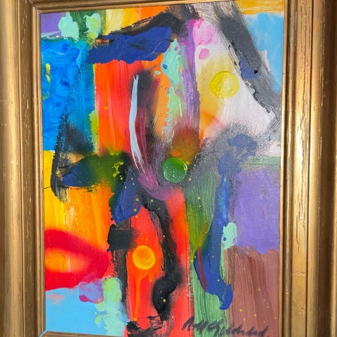 Rolf gjedsted Abstrakt maleri farverigt motiv i guldramme
