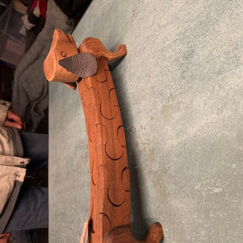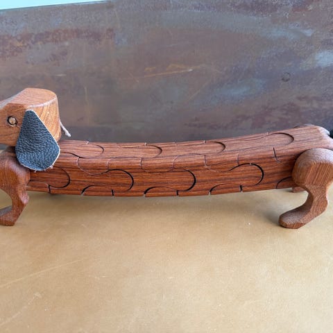 Trip trap Træfigur udformet som en lang gravhund i brun træ. Figuren har udskårne led langs kroppen og stående ben. Velegnet som dekorationsfigur på hylde, reol eller bord. Længden fremgår af målebåndet på billederne.