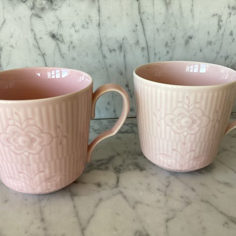 Åhléns Home krus i glas i rosa farve. Sættet består af to krus med hank og riflet struktur i glasset. Velegnet til varme eller kolde drikke i køkken og hverdag. Designet er gennemsigtigt med let rosa tone og rund form med flad bund. I meget fin stand. 8 cm høje. Sælges samlet
