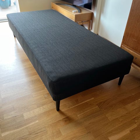 Jysk Dreamzone Plus B30 boxmadras i størrelsen 90x200 cm. Madrassen har en mørkegrå tekstilbetræk og er monteret på en træramme med lameller. Velegnet som enkeltseng eller som del af en dobbeltseng ved brug af to madrasser side om side. Passer til standard sengeben til boxmadrasser.