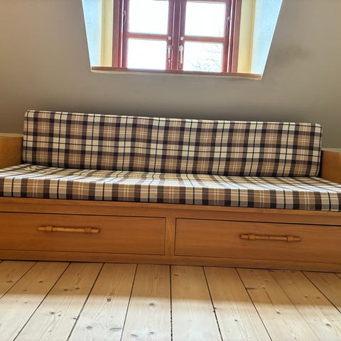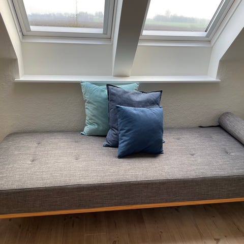 Daybed i mørkegrå stof. Fremstår rigtig pæn. Er overtaget i forbindelse med sommerhuskøb, så kender ikke mærket.