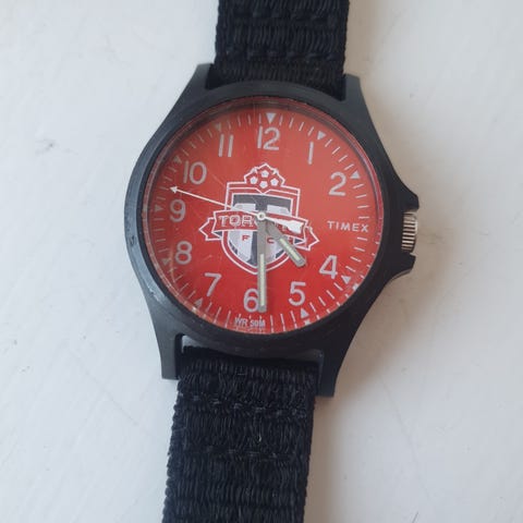 Urkassen er firkantet/let cushion-formet, TV-Screen, og lænken er i matchende sølvfarvet metal med Timex-logo på spændet. I flot og velfungerende stand.