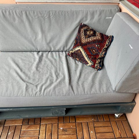 2 grå lounge-sofa-hynder, der passer til europaller. Er vandafvisende men ikke vandtæt. Med brugsspor