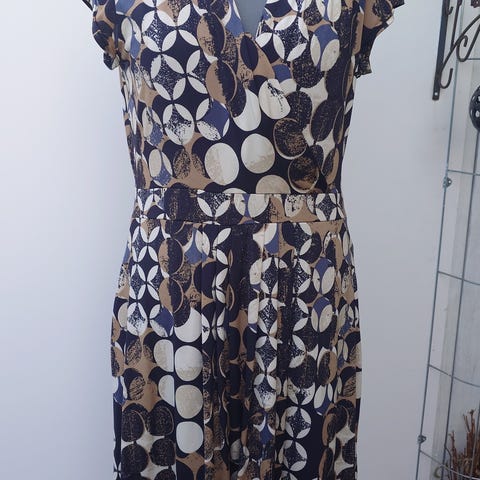 In Front hverdagskjole i størrelse L. Kjolen er multifarvet med sorte og hvide striber kombineret med ensfarvede sorte felter og kontrastdetaljer. Den har trekvartlange ærmer og rund hals. Materialet er viskose, som giver et blødt og behageligt fald. Velegnet som hverdagskjole til brug året rundt.