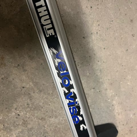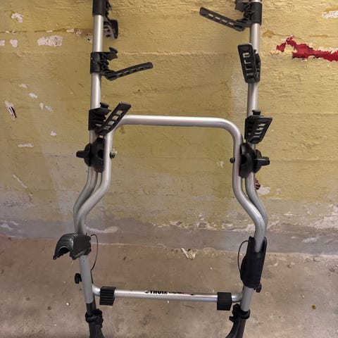 Thule cykelholder til montering på bagklap hvis bilen ikke er udstyret med anhængertræk. Cykelholderen kan klappes sammen for lettere opbevaring, når den ikke er i brug.
