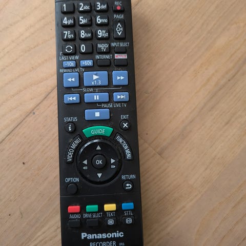 Panasonic fjernbetjening til audio system i sort. Fjernbetjeningen er beregnet til styring af Panasonic lydanlæg med funktioner som tænd/sluk, lydstyrke, lydkilder, afspilning, pause, stop, nummer- og sporvalg samt menu- og indstillingsknapper. Batterirum på bagsiden til udskiftelige batterier.