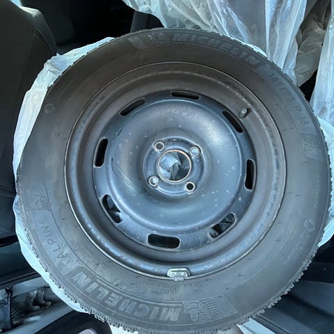 Ubrugt nødhjul med fælg, dæk med fælg i sort. Dækket er monteret på stålfælg og er mærket med hastighedsbegrænsning (80 km/t) samt anbefalet dæktryk (op til 420 kPa). Dækket er fra uge 50 2017, men har hele tiden ligget i mørke i min hjulbrønd, hvor jeg har skåret indsatsen til så det kunne være der. Mønstret på dækket er tydeligt og egnet som midlertidigt reservehjul i bilens reservehjulsbrønd. Velegnet som erstatning eller ekstra nødhjul til personbil, hvor dimension og hulafstand passer til bilens specifikationer, passer til Peugeot 308, modellen 2013-2021, ved ikke om det passer til nyere model