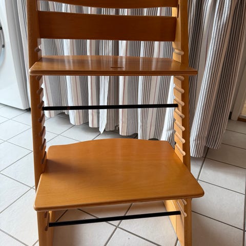 Stokke Tripp Trapp højstol i naturfarvet træ. Højstolen har justerbar siddeplade og fodplade, som kan flyttes i højden efter barnets størrelse. Designet gør det muligt for barnet at sidde ved bordet sammen med resten af familien. Velegnet til brug ved spisebord eller andre borde i hjemmet. Fremstillet i massivt træ med klassisk Tripp Trapp-konstruktion.
