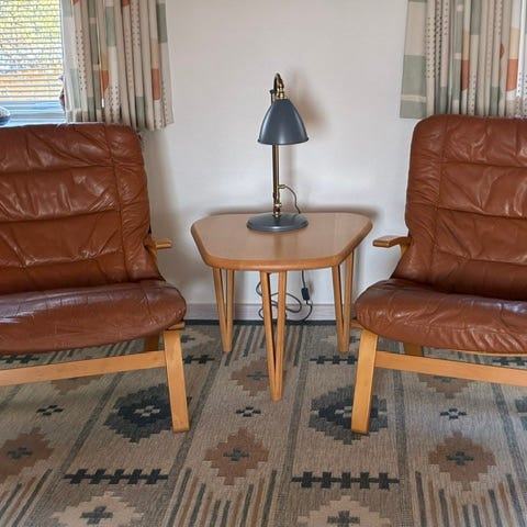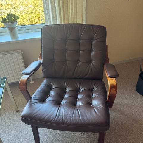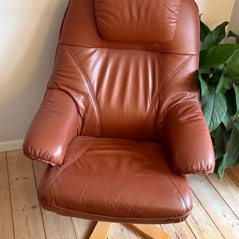 Lænestol i brun læder med højt ryglæn og polstrede armlæn. Stolen har stel og ben i lyst træ med buede armlæn. Egnet som læse- eller hvilestol i stue eller opholdsrum. Der kan forekomme mindre brugsspor på læderet, som vist på billederne.