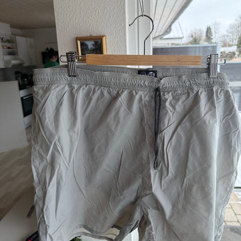 ASOS badeshorts til herre i størrelse M. Shortsene er grå og fremstillet i polyester. De har elastisk talje med snøre og indvendigt meshfor. Velegnet som lette hverdagsshorts eller til strand og fritid.