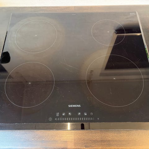 Siemens EH875MP17E induktionskogeplade i sort glas. Kogepladen har flere induktionszoner, herunder runde kogefelter og rektangulære flexzoner, som kan anvendes til forskelligt kogegrej.
