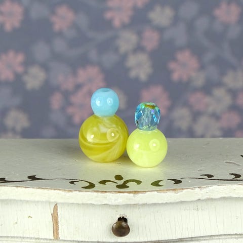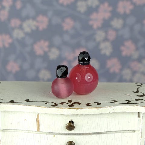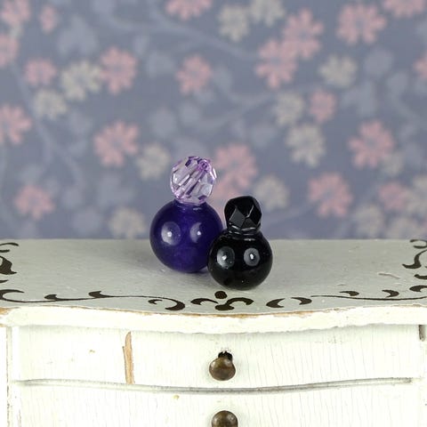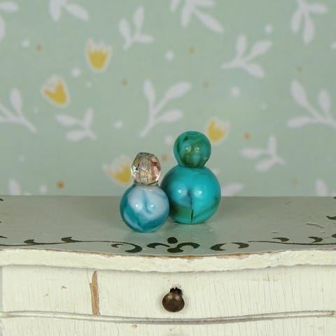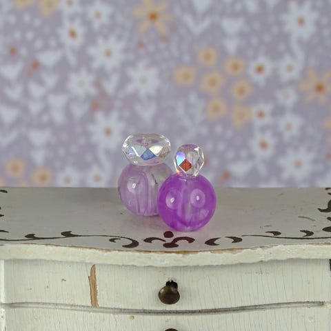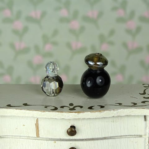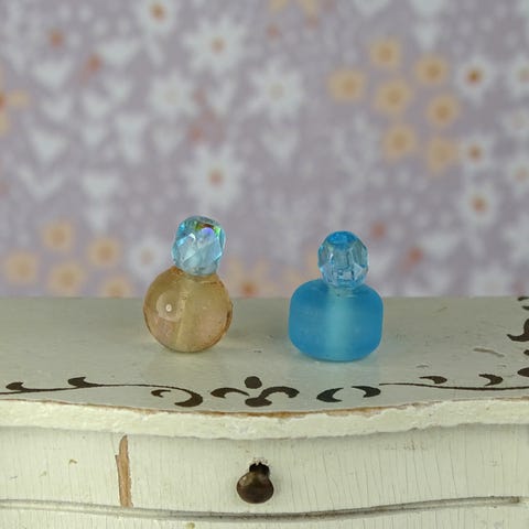 2 stk. miniature dukkehus parfumeflasker lavet af glas- og plasticperler.