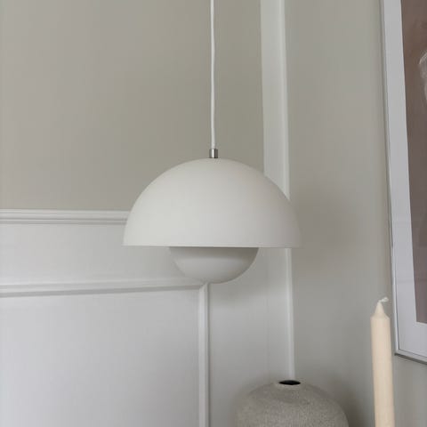 &Tradition Verner Panton pendel lampe i grå nuance. Lampen har en halvkugleformet skærm med en mindre indvendig kugle, som hjælper med at fordele lyset nedad og skabe et blændfrit lys over f.eks. spisebord eller arbejdsbord. Ophængt i ledning fra loftet med indvendig metalophæng. Velegnet til brug i køkken, spisestue eller andre opholdsrum, hvor der ønskes direkte belysning over et bord eller en flade.