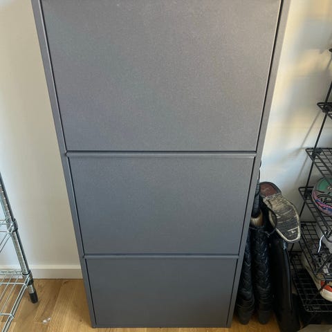 Fin skoreol i hvidlakeret metal. Kan hænges op eller stå på gulvet. Der er fem rum.