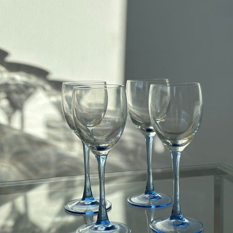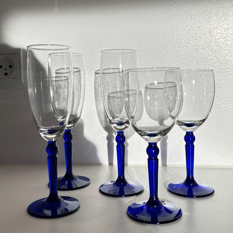 Luminarc champagneglas med blå fod. Sættet består af høje, klare glas med farvet blå stilk og fod, velegnet til servering af champagne og andre mousserende drikke. Fremstillet i glas med præget Luminarc-logo i bunden. Egnet til brug ved borddækning til fester, middage og andre lejligheder.