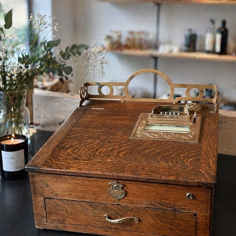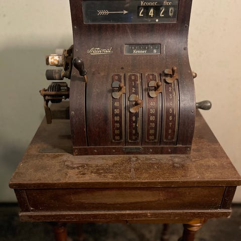 Ældre kasseapparat fra E. Jensens fabrik i Grindsted i massiv træ. Messingplade på fronten med teksten "Kassa", så den har nok været anvendt i Sverige.