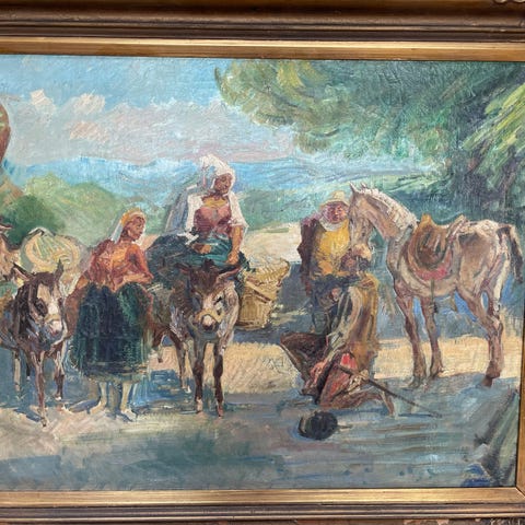 Den ungarske maler F.Krupka (1870-1928 )maleri med motiv af en udendørs markedsscene med flere personer, kurve med grøntsager og en hest foran bygninger. Maleriet er rektangulært og monteret i en profileret ramme. Der ses signatur i nederste hjørne på forsiden samt håndskreven tekst på bagsiden med blandt andet stedangivelse Aalborg og årstal samt garanti for ægtheden af maleriet.
