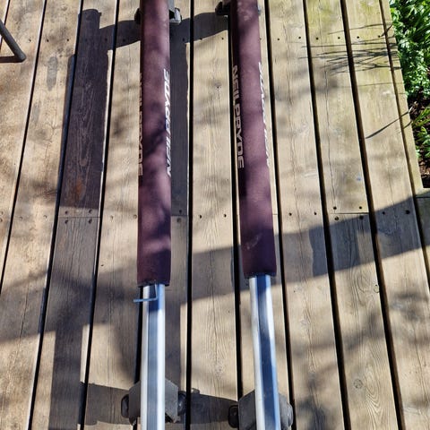 Thule tagbøjler i sølvfarvet aluminium med sorte plastfødder. Brugt på BMW 520d f11 wingbar edge