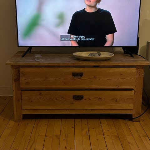 Kommoden er lavet af varmlakeret fyrretræ og man ser de fine træårer og knaster igennem lakeringen.