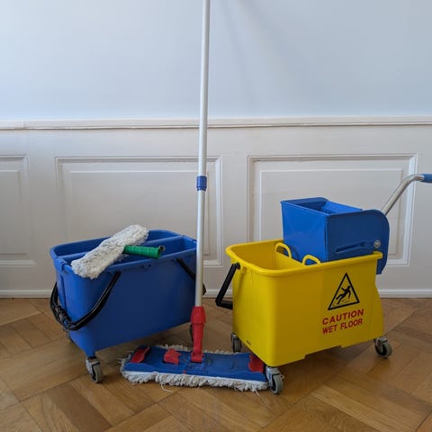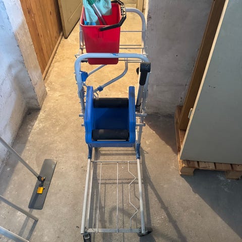 Rengøringsvogn samt vinduespudservogn, RENGØRINGSVOGN på hjul inddelt i to rum til henholdsvis rent og snavset vand med moppepresse, gulvmoppe bestående af aftagelig moppe og teleskopstang med udløserknap til moppen, VINDUESVASKEVOGN på hjul opdelt i to rum til henholdsvis rent og snavset vand med moppe samt vinduesskraber, professionelt udstyr som er praktisk og solidt, fremstår i overordentlig pæn stand, nypris ca. kr. 2.000, sendes ikke men kan afhentes i Helsingør eller i København Ø, samlet pris for alt udstyret kr. 400
