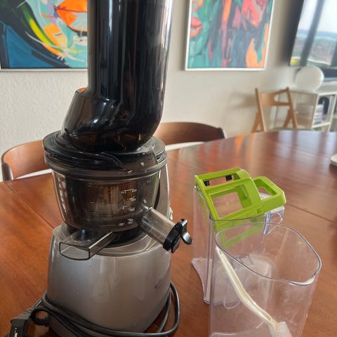 Witt Kuvings slowjuicer til hele frugter og grøntsager. Juiceren er konstrueret til skånsom koldpresning, hvor råvarerne føres ned gennem tragten og langsomt presses for at udvinde juice. Egnet til fremstilling af juice, smoothies, frosne desserter og babymad afhængigt af tilbehør. Maskinen har en lodret beholder med gennemsigtigt låg og opsamlingsbeholder til juice samt separat udgang til frugtkød. Velegnet til almindeligt køkkenbrug, hvor man ønsker at udnytte hele frugter og grøntsager i drikke og andre opskrifter.