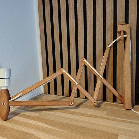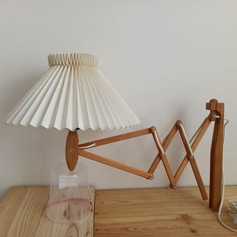 Le Klint sakselampe af egetræ. Rigtig fin stand med helt ny skærm. Har fået ny ledning og stik.