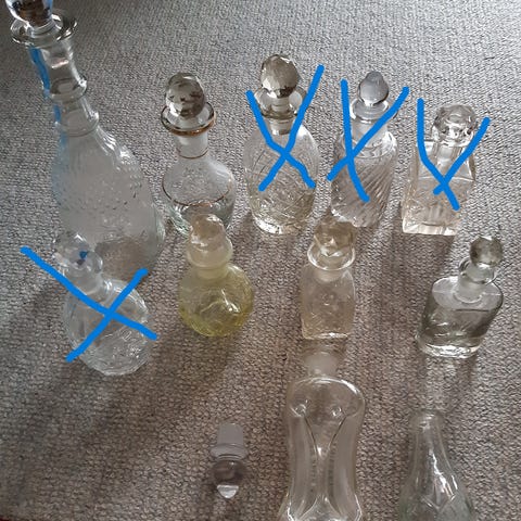 Karaffelsæt i glas bestående af fire karafler. Tre karafler er i klart glas med slebne mønstre, hvoraf to har hank og en har rund prop og bred fod. Den fjerde karaffel er i rødt og klart glas med slebet dekoration og matchende prop.