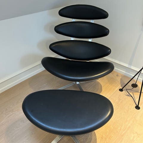Sælger en moderne designklassiker: Stokke Peel (nu produceret af Varier) i sort læder med matchende fodskammel. Stolen er skabt til dig, der ønsker både et markant visuelt udtryk og markant bedre siddekomfort end i en standard lænestol.