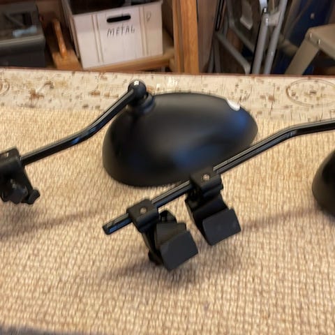 Universal ekstra sidespejle til montering på bilens eksisterende spejle, velegnet til brug ved kørsel med campingvogn eller trailer. Sættet består af to spejle med ovale spejlflader og justerbare arme. Spejlene har fastgørelsespunkter og håndtag med blå detaljer samt sølvfarvede stænger. Kan justeres i vinkel for bedre udsyn bagud og til siderne under kørsel med anhænger.