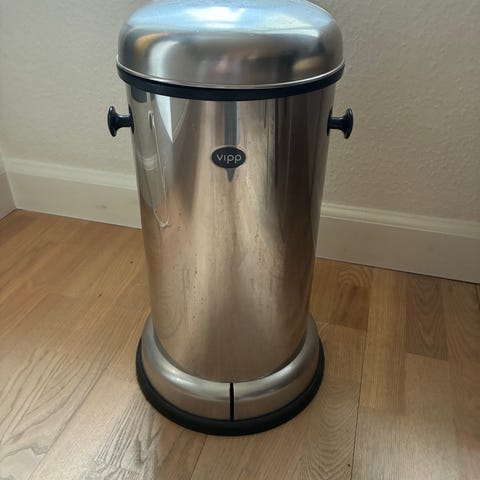 Ældre, brugt og temmelig støvet skraldespand fra Vipp. Karamelfarvet. Jeg har ikke målt den i højden, men skønner, at den er ca. 50 cm høj.