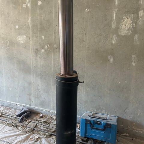Metalbestos Wood røgrør med isolering, beregnet til aftræk fra brændeovn eller lignende installationer. Røret har en diameter på 130 mm og en længde på 1000 mm. Yderkappen er i sort metal, og røret leveres med isoleret kerne som vist på billederne. Velegnet til brug i skorstens- og røgsystemer, hvor der kræves isoleret stålskorsten med denne dimension.