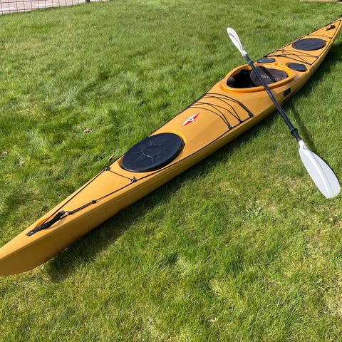 Havkajak fra Tahe Marine i rød farve med hvid bund. Kajakken har lukket cockpit med sæde og ryglæn samt elastikliner på dækket til fastgørelse af udstyr. Foran og bagpå er der luger til opbevaring. Kajakken er udstyret med ror i agterenden, der kan hjælpe med styring. Der medfølger pagaj, som ses på billederne. Pagaj, spreydeck, padelvest og cover medfølger.