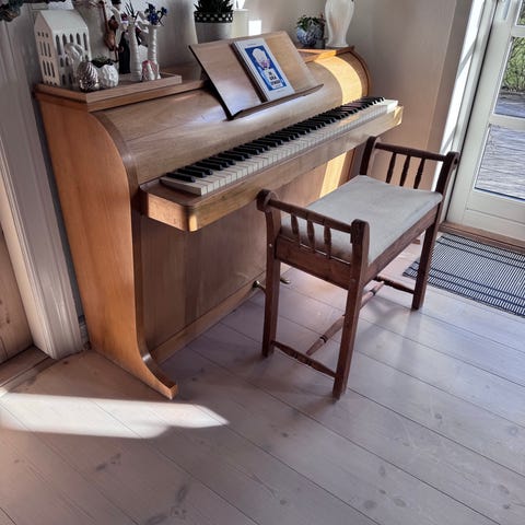 Hellas opret klaver i lyst træ. Klaveret har tre pedaler og traditionelt klaviatur med sorte og hvide tangenter. Kabinettet er udført i lyst træ med synlig træstruktur. Toppen af klaveret trænger til at blive pudset ned. Ellers i rigtig fin stand.