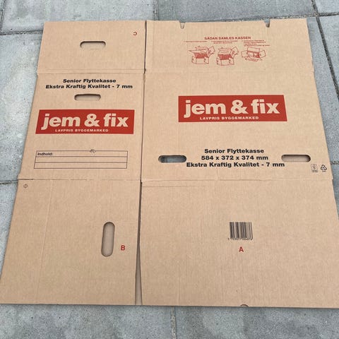 18 stk. blandet flyttekasser fra Harald Nyborg og Jem og fix de store af dem samt Bobbel plast en halv rulle og indsats til en papkasse til glas.
