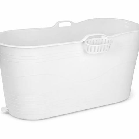 Folde badekar fra Tubfamily XL i lyseblå og hvid. Badekarret har låg i flere sektioner med integrerede afsætningsfelter og hulåbning, samt aftagelig opbevaringsbakke på siden. Indvendigt er der skridsikre felter i bunden og ryglæn. Badekarret kan foldes sammen og stilles op ad væggen for pladsbesparelse. Velegnet til brug i brusekabine eller mindre badeværelser.